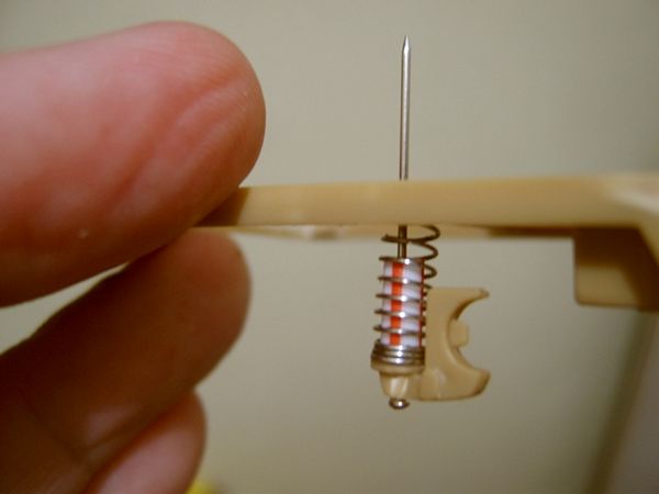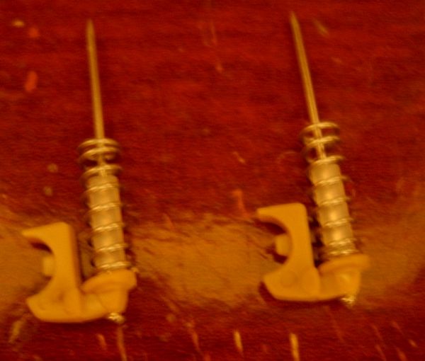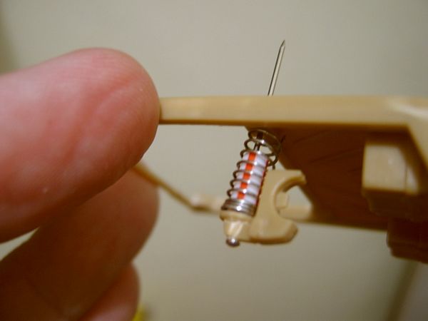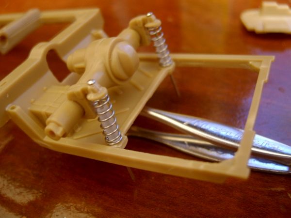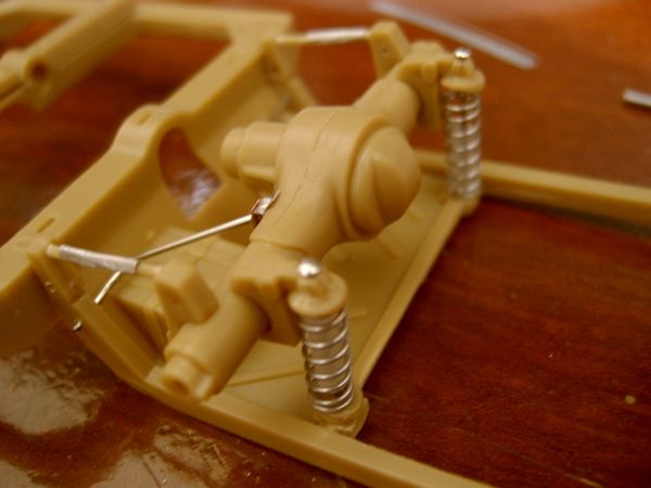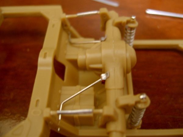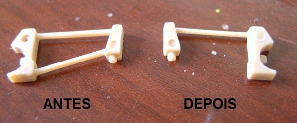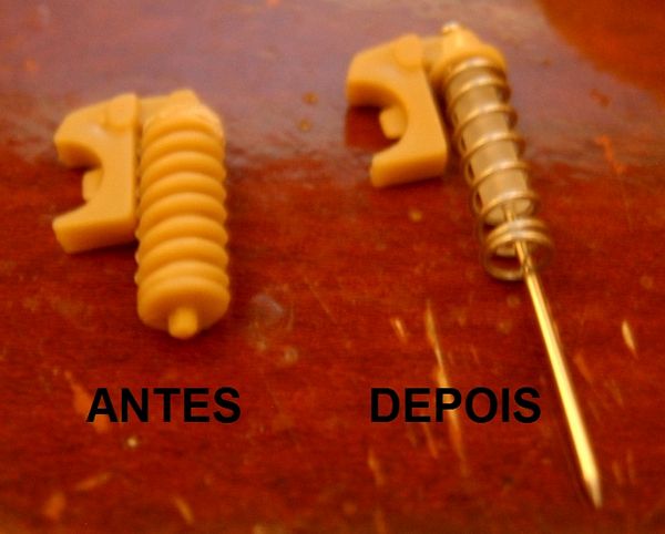 Avaliando as instruções da AMT e comparando-as com as fotos do Corvette real, decido modificar a suspensão traseira. É que o modelo apresenta o diferencial com eixos simétricos e fixos e a proposta da AMT para a suspensão não convenceu muito. Parti para as modificações. Primeiro eliminei a mola irreal da peça e acoplei molas reais usadas em canetas esferográficas. Um pequeno canudo é usado para simular o amortecedor e um alfinete de costura funciona como a guia metálica que unirá o conjunto...
