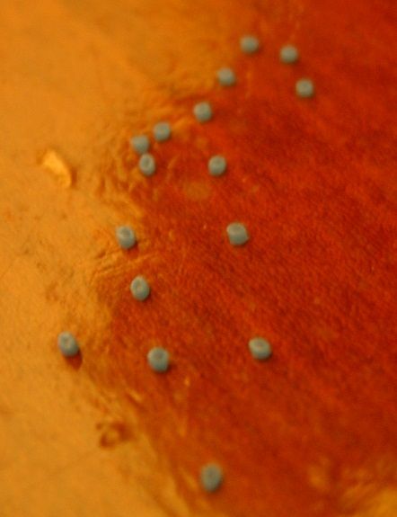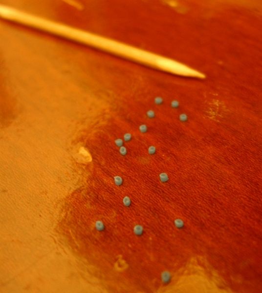 Os "parafusos" são colados em substituição aos pontos anteriormente feitos com caneta de CD...