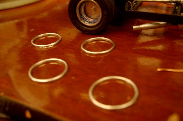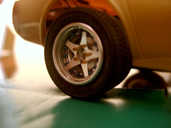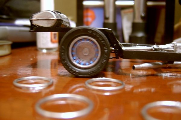 RODAS (PARTE 03): Observando as últimas fotos do modelo já se percebe que faltam ainda os aros externos que darão aos pneus a aparência de perfil baixo. Assim, aros complementares são cortados para retratar este detalhe...