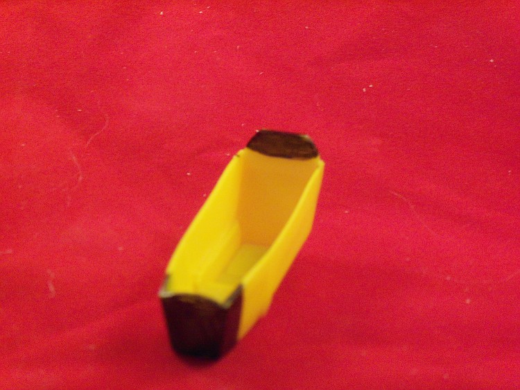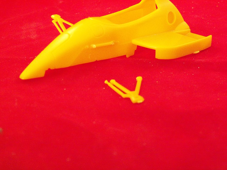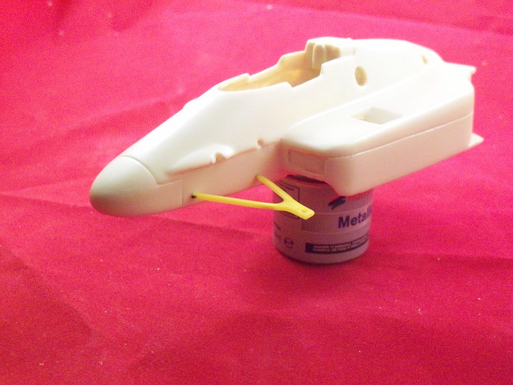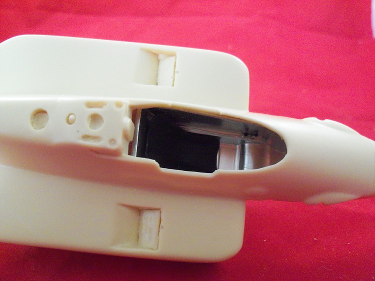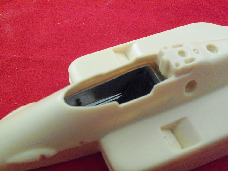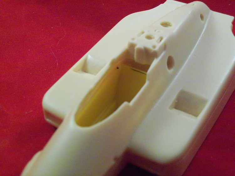 A estrutura do cockpit precisa ser encurtada em comprimento e altura para encaixar na peça em resina. As partes a serem removidas estão marcadas em preto.