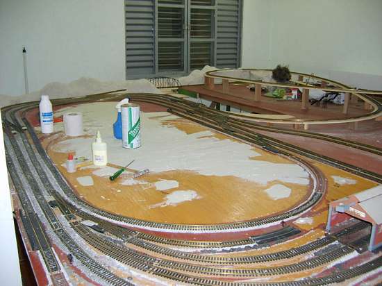 As calçadas eu uso EVA (um tipo de borracha leve). Nas pintura estou utilizando látex e tintas automotivas. Também utilizo gesso de poucas proporções. Dependendo do local, com o gesso, eu faço pedras, rochas, etc.