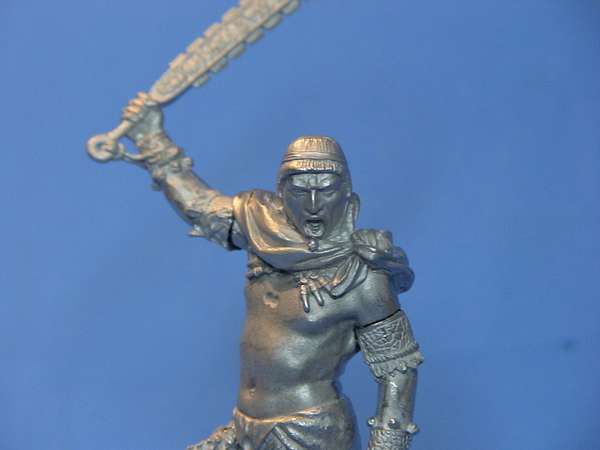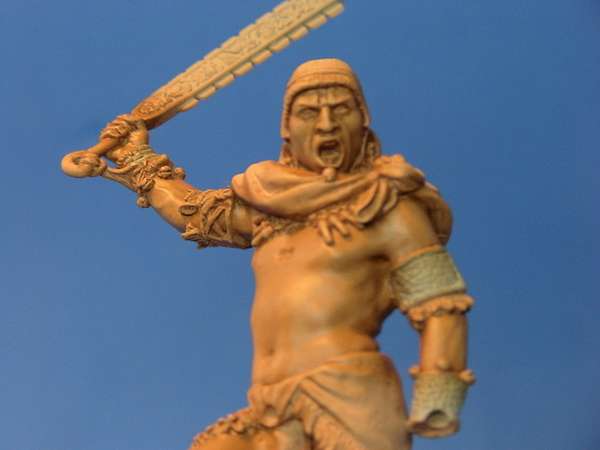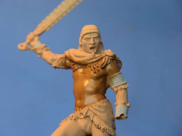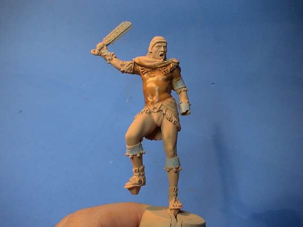 O rosto está ainda com as primeiras sombras, ainda vou reforçar um pouco e faltam as luzes também. O óleo demora um pouco para secar (às vezes, uso uma estufa com lâmpada para acelerar) e como tem muita pele dá mais trabalho. Quanto a tinta óleo é só pintando que você vai sentindo a evolução e pegando prática,ainda tenho dificuldade com algumas técnicas, principalmente com as tintas acrílicas (para dar os efeitos de sombra e luz), para isso ainda prefiro o óleo, mas tenho treinado com as acrílicas para ver se melhoro. Cada um se adapta melhor a cada têcnica, mas acho legal tentar combinar os vários tipos. O pessoal que pinta há mais tempo costuma usar Humbrol e óleo, que é o que havia na época. Hoje em dia uma boa parte já pinta com acrílico pela vantagem de secar mais rápido; a gama de cores é excelente e a diluição é com agua ou álcool evitando o incômodo do cheiro da aguarraz ou thinner. Como aprendi a pintar com óleo, ainda mantenho uma boa parte da pintura com essa técnica. As tinta óleo sao um pouco mais caras, mas duram muito, e você pode começar pelas mais básicas (não precisa ter todas),tenho um pouco mais de facilidade nos efeito. mario Normalmente para pintar os olhos em figuras 54mm, uso a mesma tecnica que nas 75mm e 90mm: Pinto primeiro o branco. Após isso, o olho esquerdo, depois o direito. Outra coisa muito importante,que faz a diferença é o pincel que você está usando; Tem vários bons, mas o melhor de todos é da Winsor 000 série 7. É meio caro, mas faz uma grande diferença ,e se você cuidar direitinho, ele dura bem. Também uso lupa para coisas muito pequenas. A técnica que usei no rosto é a mesma que usei no corpo. Ainda tenho dificuldade na pele, pois acho sempre que dá para dar uma melhorada. A pele da figura é o mais importante, pois a nossa tentativa é deixar a figura o mais natural possível, ficando parecida com a pele humana. Eu faço o seguinte: tento não fugir do que tenho mais dificuldade (pele,branco), pois com treinamento, pode ter certeza que a pintura vai melhorando. O rosto está praticamente terminado. Se observar, pode-se ver o piercing na boca, o contorno dos olhos e uma pontinha de vermelho nos cantos.