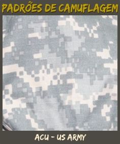 ACU - US ARMY: Novo padrão de camuflagem digitalizado (ACU - Army Combat Uniform), exclusivo do Exército dos EUA, dito (controversamente) como o mais eficiente tipo de camuflagem em váriados tipos de ambientes. Começou a ser inserido nas linhas de frente em 2007, em substituição ao tradicional padrão Woodland (em ação desde 1981).