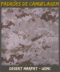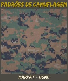 MARPAT - USMC: Novo padrão exclusivo de camuflagem do Corpo de Fuzileiros Navais dos EUA, veio para substituir o Woodland, com maior eficiência de mimetismo em regiões de floresta e mata. Composto por quatro cores distribuídas em uma trama Bitmaps digitalizados. Seu nome vem de "MARine Disruptive PATtern.
