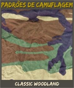 WOODLAND CLÁSSICOO: Usado durante praticamente 20 anos pelas tropas Norte-Americanas (pós-Vietnam), foi elaborado de forma a se mesclar com praticamente todo os tipos de vegetação, sendo copiado e utilizado por muitas forças militares e pára-militares ao redor do mundo.