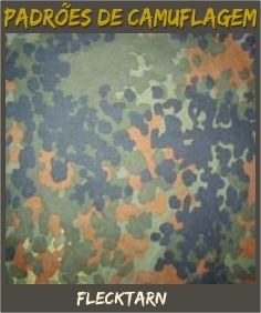FLECKTARN ALEMÃO: Padrão de camuflagem oficial do Exército Alemão, inserido em 1990. FLECKTARN vem da junção das palavras Fleck (ponto, mancha) e Tarnung (camuflagem). Este padrão de camuflagem é também chamado de German Dots, Flecktarnmuster, Fleckentarn e Flec.