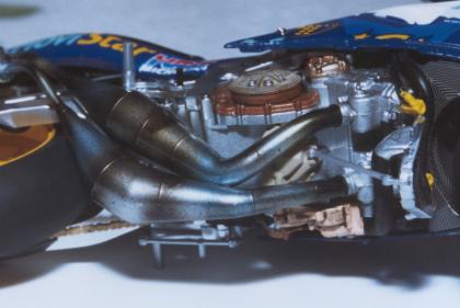 Os escapamentos, seguindo as instruções, devem ser pintados de uma cor somente. No entanto, o resultado final não parece realista. Felizmente, podemos utilizar técnicas simples para que eles tenham um resultado bem mais interessante. Inicialmente pinte o conjunto com uma boa tinta prata; de preferência que seja do tipo esmalte (enamel). Se preferir, pode usar bare-metal também. A desvantagem do bare-metal é que se a pintura não der certo, será preciso refazer tudo do início.