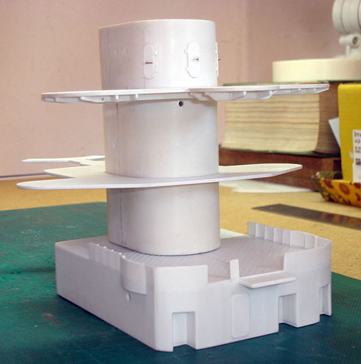 Sala de sinalização(e seu shape em curva) atachado, bem como aros de metal da ponte sendo produzidos.