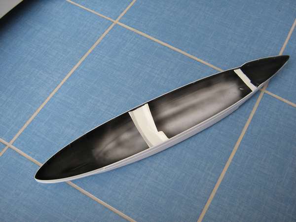 O modelismo naval geralmente implica na questão de fazer o navio navegando ou não. Há aqueles que preferem o modelo interiço, sobre suportes, e aqueles que preferem fazer um relevo de mar. É claro que este segundo exige habilidades do modelisma, como dioramista também. Esse texto, naturalmente é direcionado a este segundo grupo. Os modelos em escala pequena (1/600, 1/700 e 1/1200) geralmente são do tipo water-line, ou seja, com o caso cortado na linha d'água e dispensando qualquer tipo de suporte. Os modelos maiores, no entanto, não costuma vir com essa opção. Aqui, mostraremos como criar um modelo water-line a partir de um casco interiço. Primeiramente, monte o casco (se for em duas metades). Depois disso, com alguns pedaços de sprue ou plasticard, faça uns suportes nas laterais do internas casco. Isso irá ajudar o manter o casco firme. Cuidado para não forçar o casco para fora, o que deixaria o deck com sulcos na hora de colar. Em todo caso, faça um teste de encaixe com o deck, para garantir.