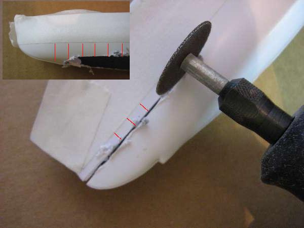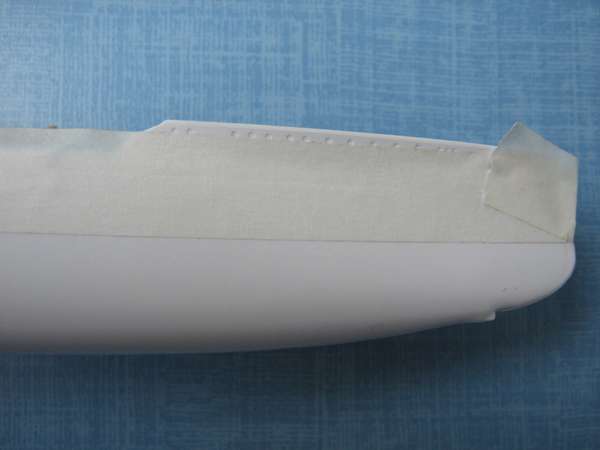 Agora, identifique a linha d'água. Geralmente, esses modelos têm uma pequena linha marcada, o que facilita o trabalho. Passe uma fita crepe, apenas para não perdemo-na de vista, durante o corte. Com uma Dremel e lixa de corte circular, corte o casco, alguns milímetros abaixo da marca. Isso será necessário por causa dos efeitos de ondas (mais altas ou mais baixas que a linha). O corte será mais limpo se você seguir a direção do giro da Dremel. Lembre-se também, que ao se aproximar da popa ou proa, a linha de corte deixará de ser paralela a linha d'água e você deve encurvar o corte para baixo da mesma.