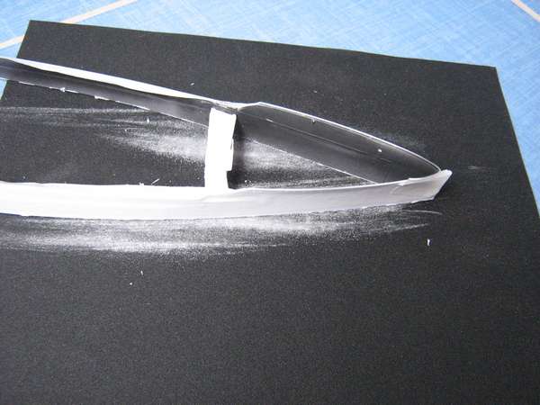 Após cortar a parte debaixo do casco, retire o estireno derretido e faça o alinhamento do casco. Coloque o barco sobre uma superfície plana e verifique se o mesmo está alinhado (como o barco balança com as ondas, um defeito mínimo não será nenhum tragédia). Agora com uma lixa grossa (150 a 220), passe o casco sobre a mesma até que todo o casco toque a superfície plana.